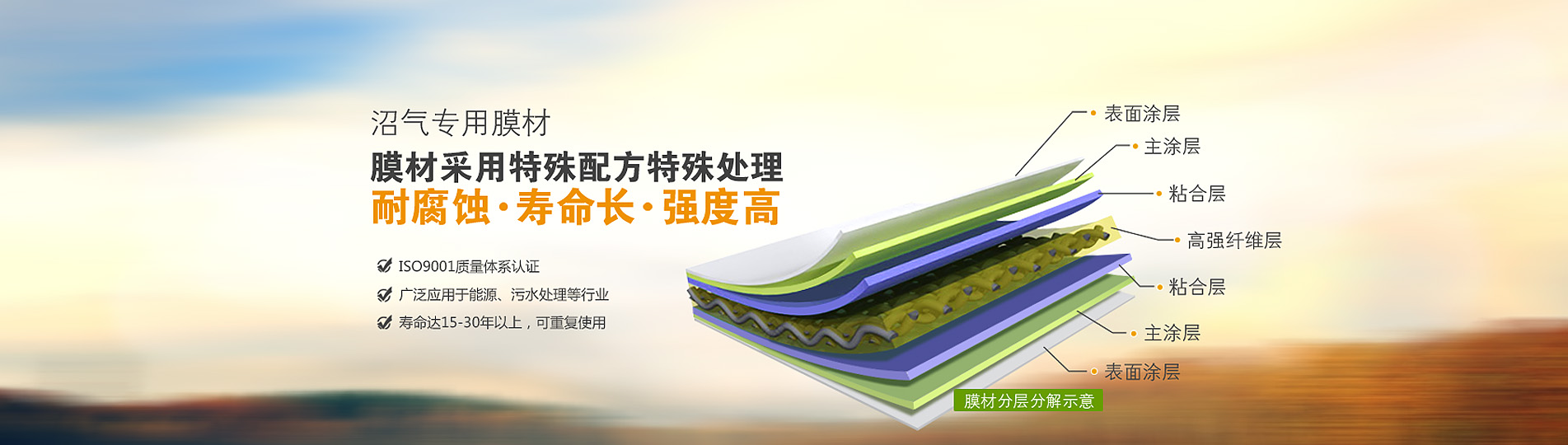 ● 雙膜氣柜材料同時具有抗沼氣腐蝕、抗紫外線和微生物的功能。常規使用壽命在10—25年以上,期間無需防腐處理.